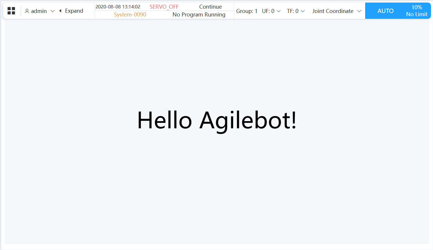 Currently, we provide the use of standard frontend projects to create Web Mini Programs. In this demonstration, we will create a Web Mini Program type extension whose function is to display "Hello Agilebot!" on the page.