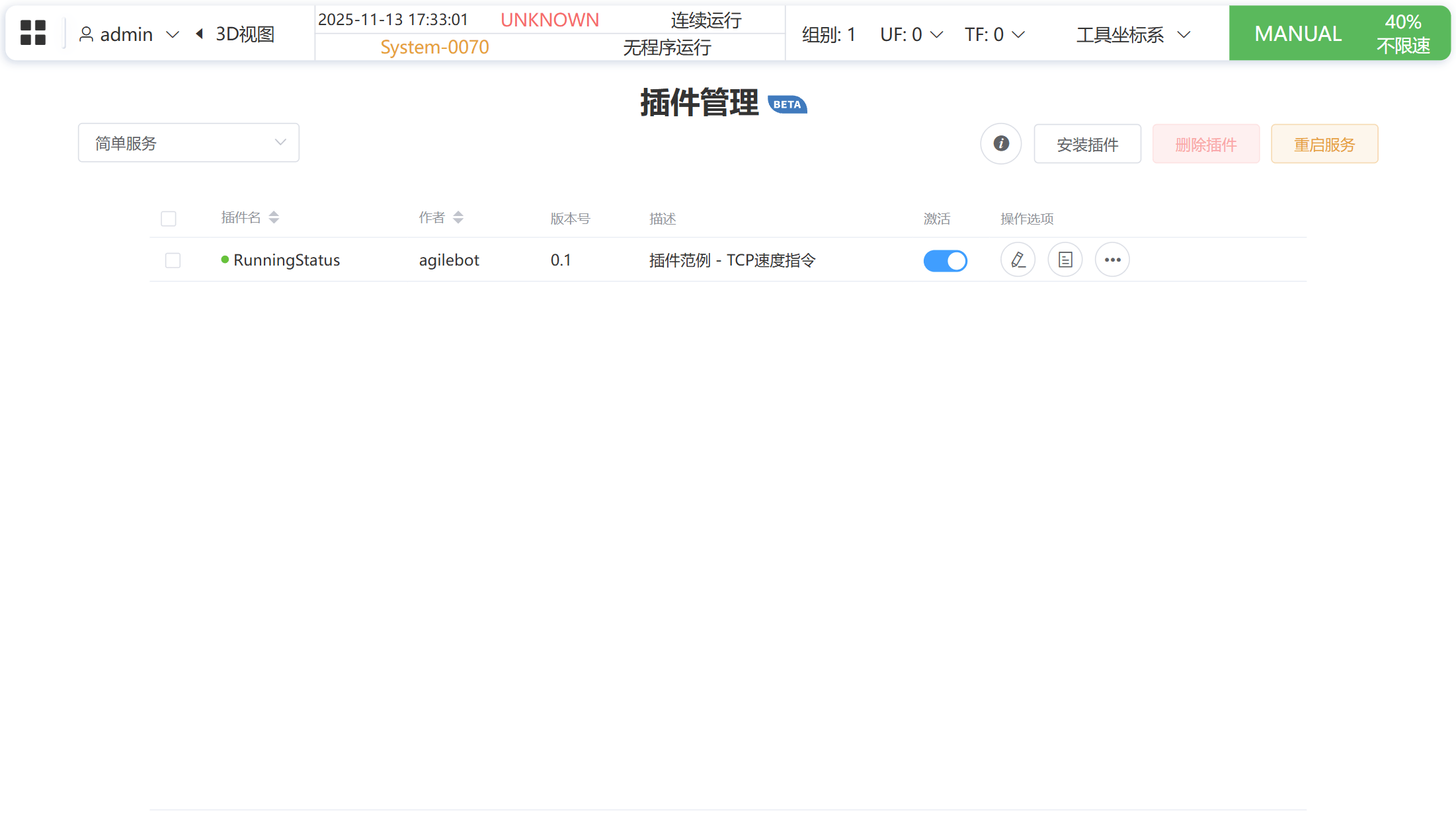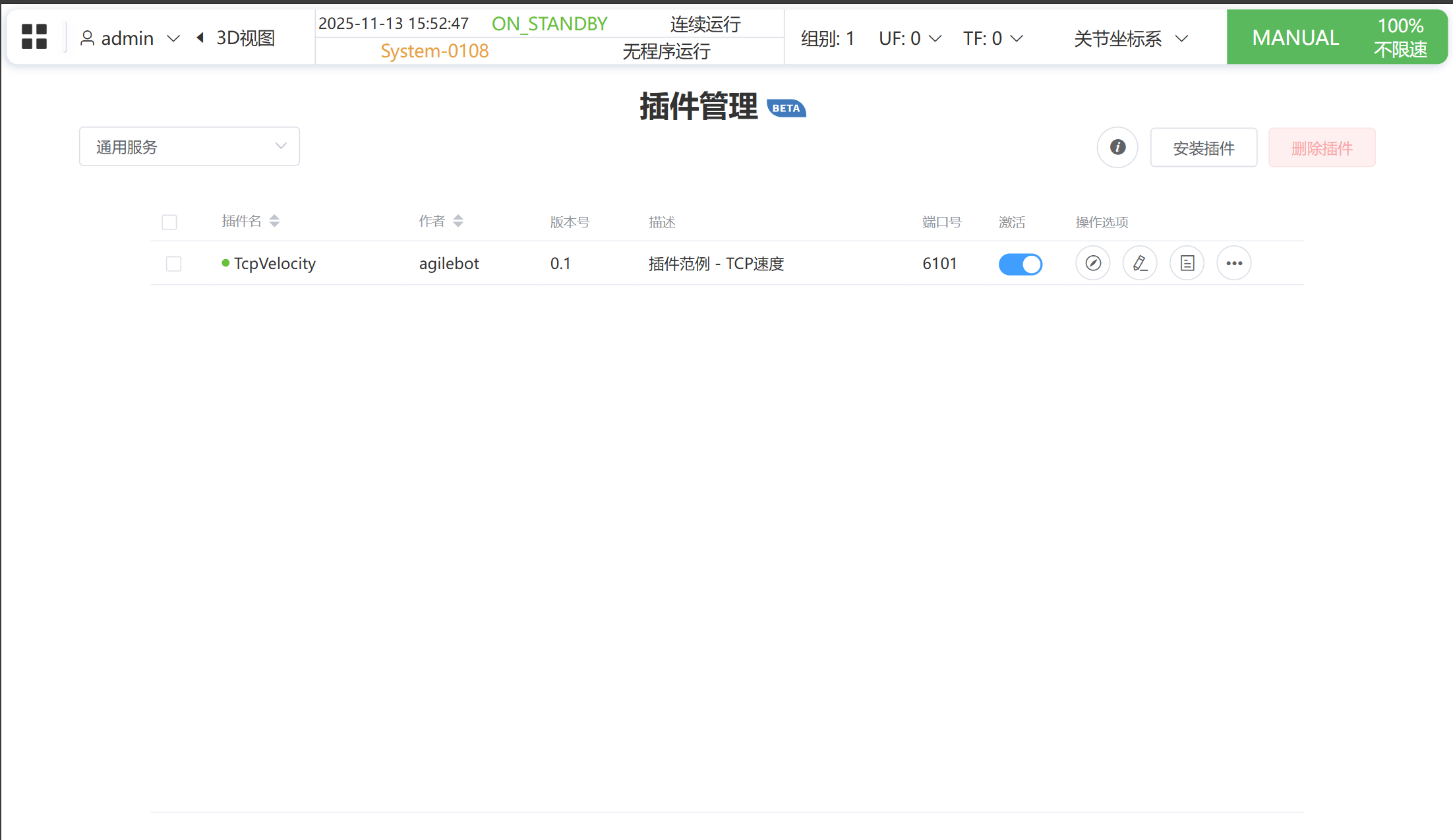 TcpVelocity 插件围绕机器人的 TCP 末端速度提供一套端到端的监控和配置体验。它包含一个通用服务(前端 + 后端)和一个可以在用户程序中被 CALL_SERVICE 指令调用的简单服务,核心能力如下: