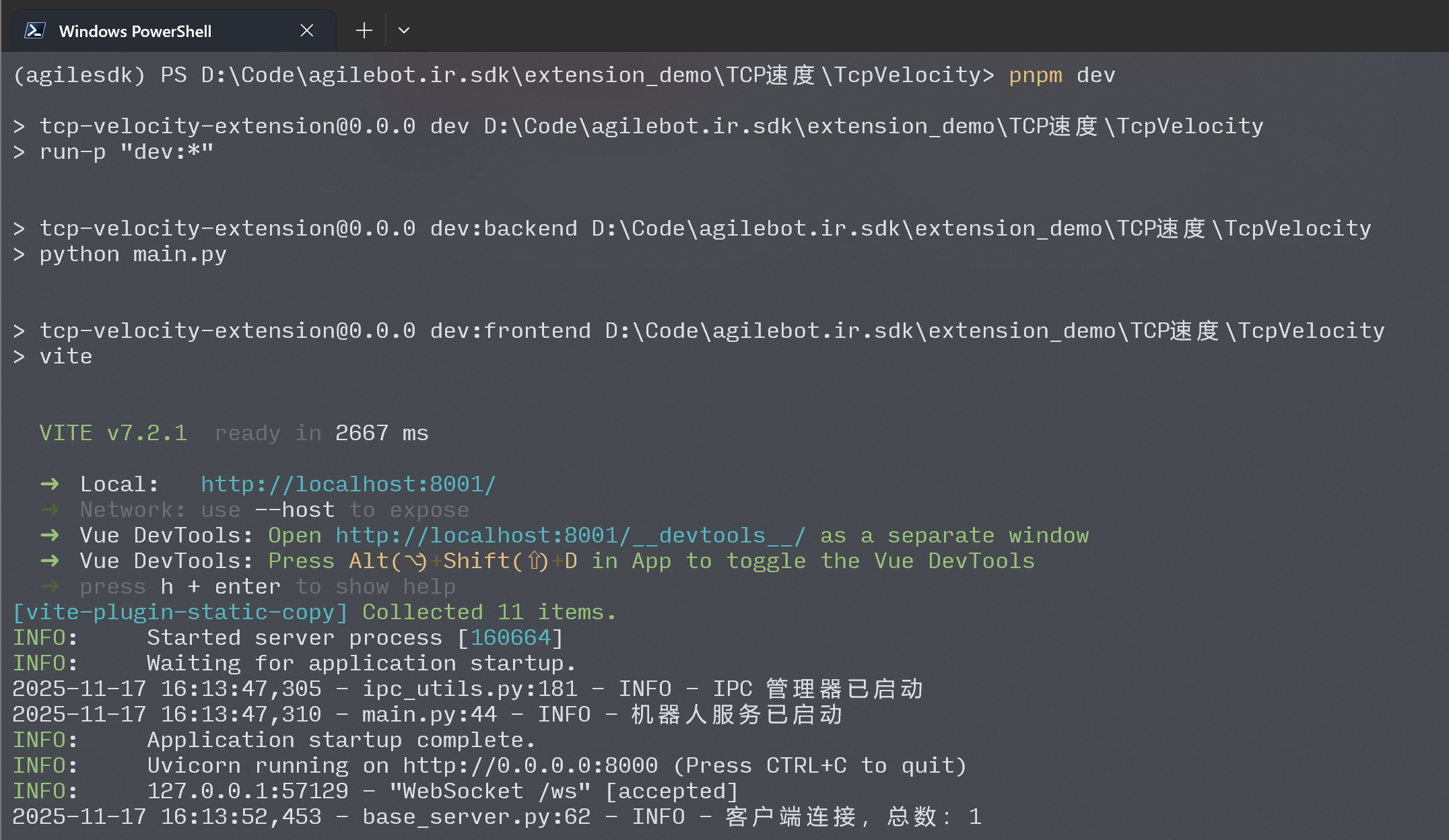 pyipc = IPCManager( spawn_proc=lambda q: start_robot_process(ROBOT_IP, q), handler=_ipc_handle, log=logger, watch_interval=2.0, ) async def _ipc_handle(item): await ws_server.broadcast(item) if isinstance(item, dict) and item.get("type") == MessageType.TCP_VELOCITY: SharedState.set("last_tcp_velocity", float(item.get("velocity") or 0.0))- 服务启动时用