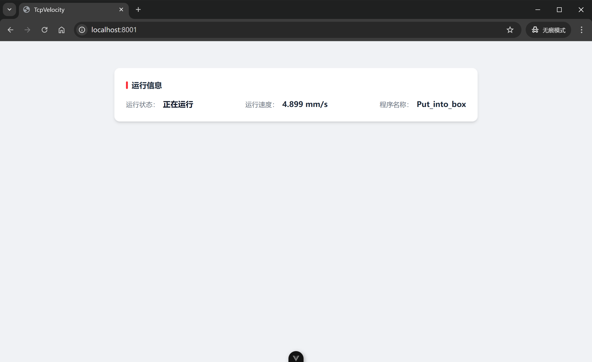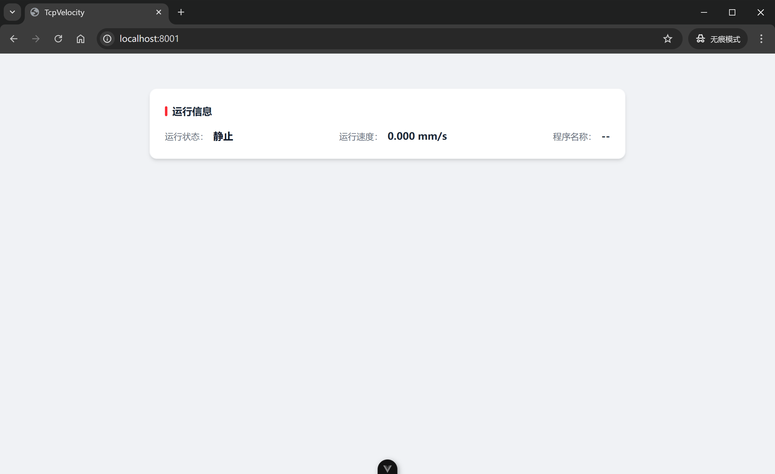 tsconst { data } = useWebSocket('/ws', { autoReconnect: true, }) watch(data, (rawMsg) => { const msg = JSON.parse(rawMsg) if (msg.type === 'tcp_velocity') { velocityText.value = `${Number(msg.velocity).toFixed(3)} ${msg.unit || 'mm/s'}` } else if (msg.type === 'running_program') { programName.value = msg.program_name || '--' } })- 前端