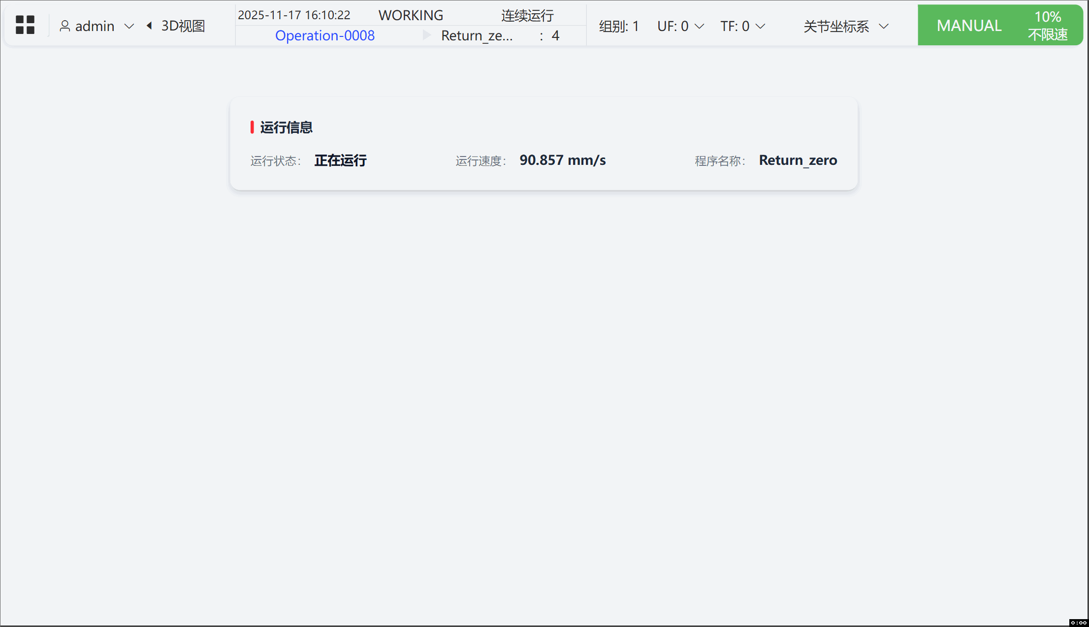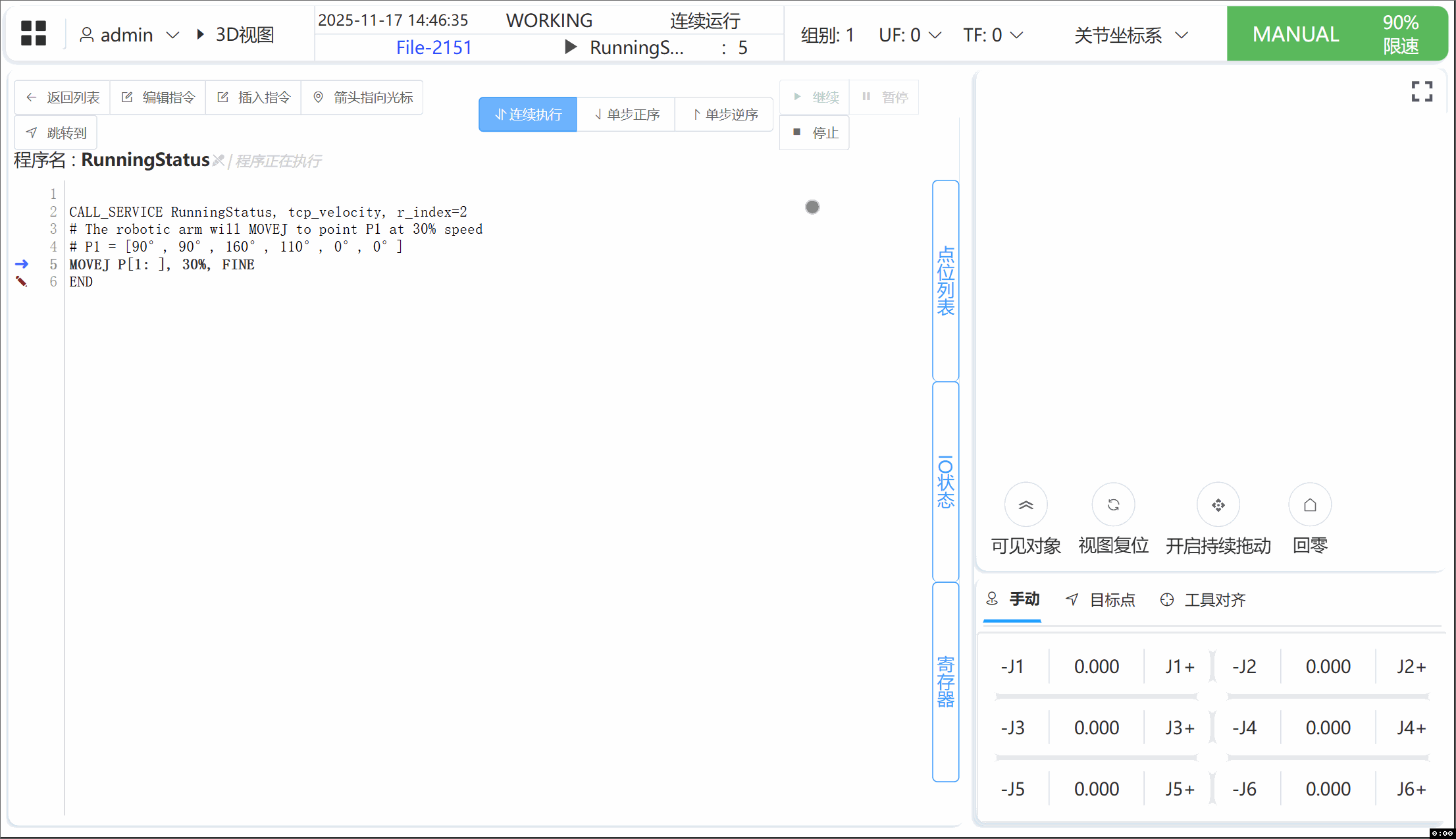 - 实时状态显示: 在界面上显示机器人的实时运行状态、TCP 速度以及当前执行的程序名称。