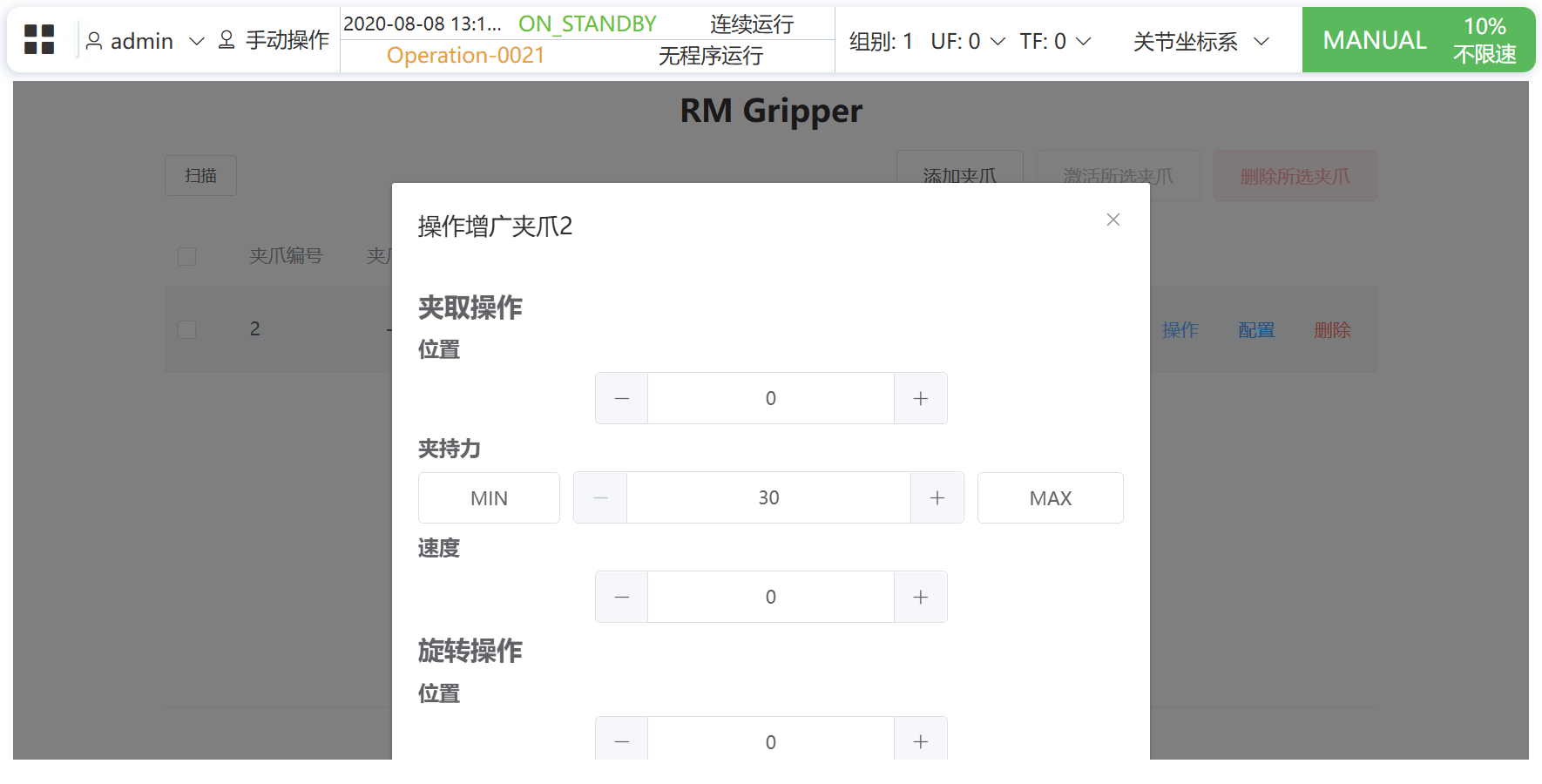 点击 操作 按钮,可对手爪进行夹取和旋转操作