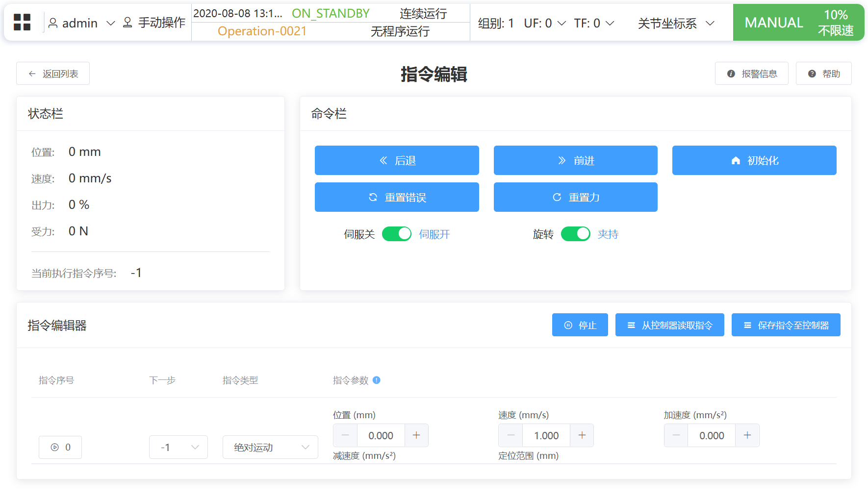 | JOG - | backward | - gripperId: 手爪 ID - step_length: 步长,默认为 1 |