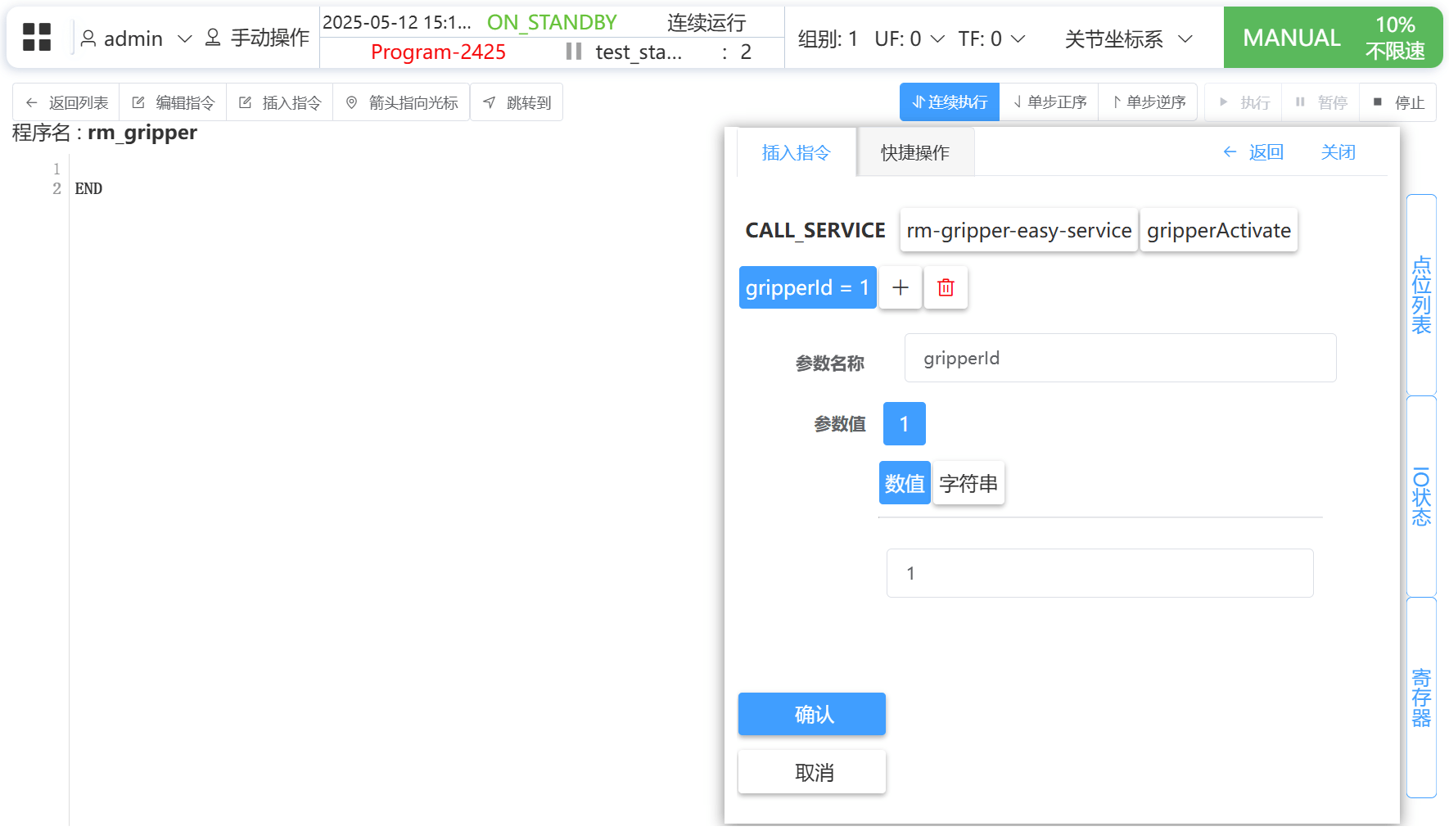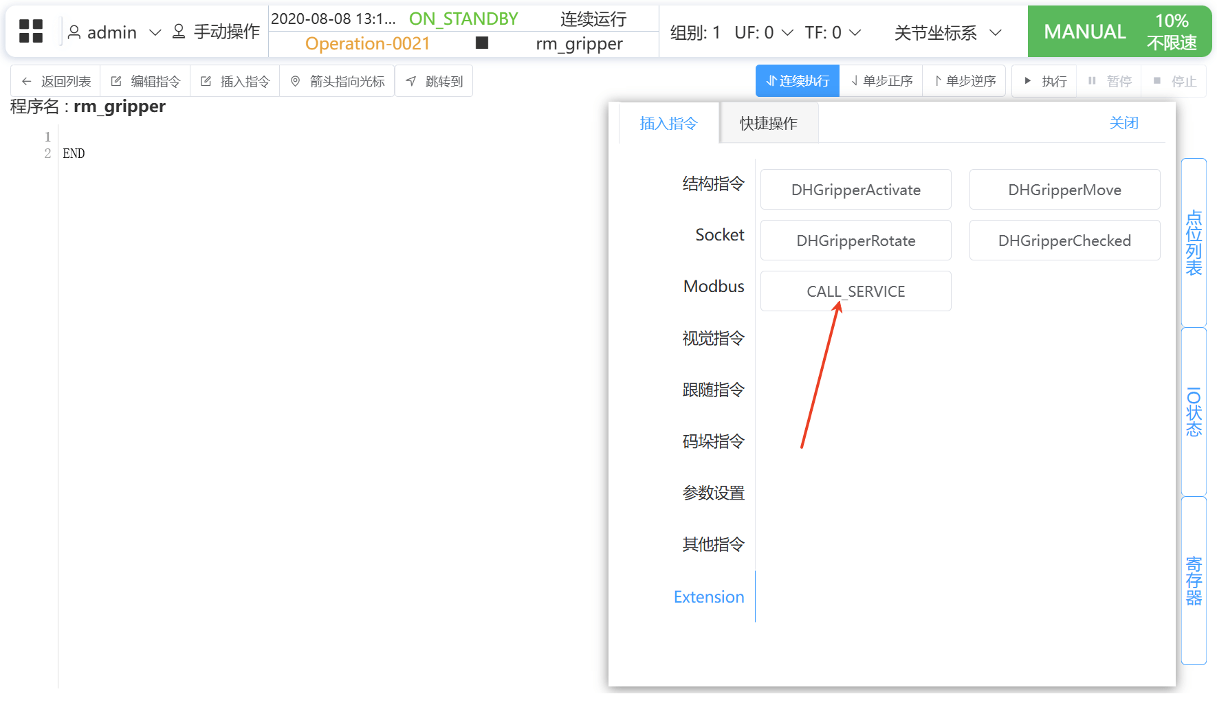 打开 程序 - 新增程序 界面,使用 CALL_SERVICE 指令可调用 增广夹爪后端 中的相关方法。