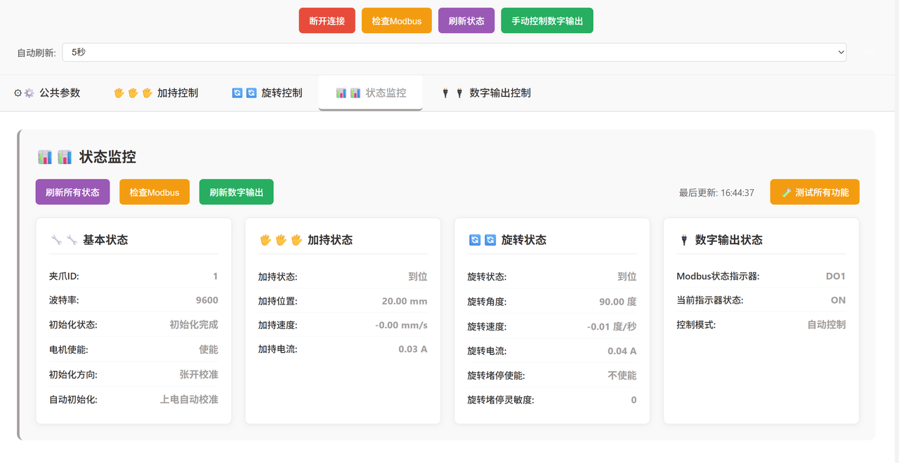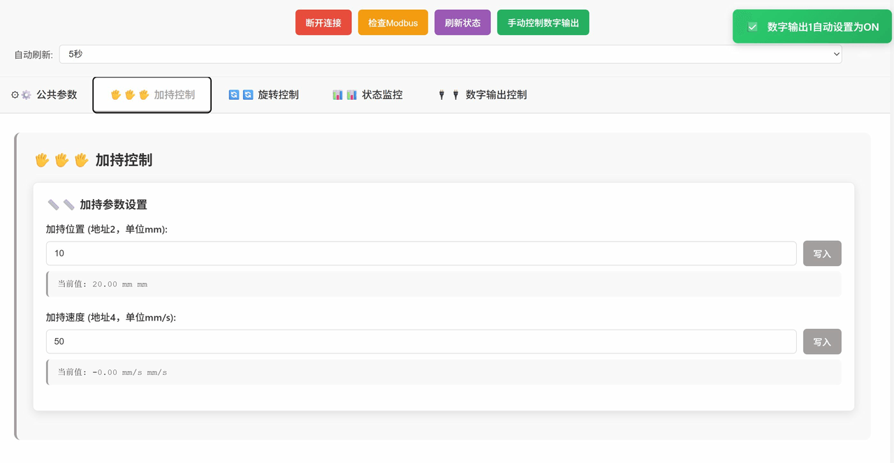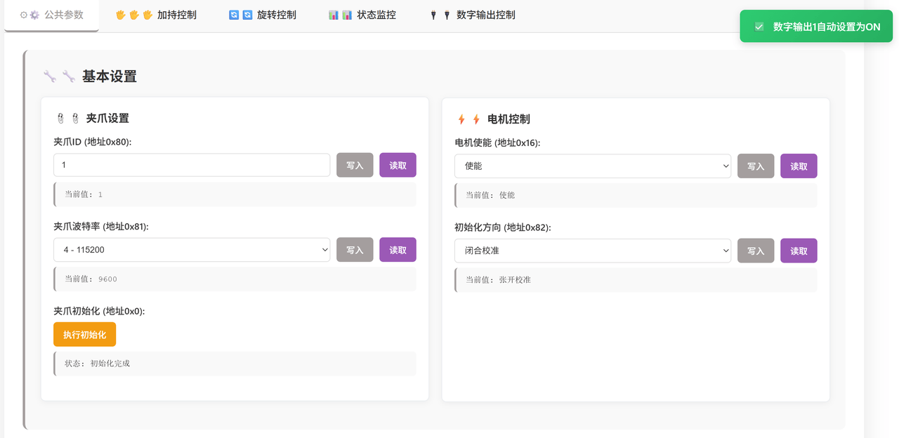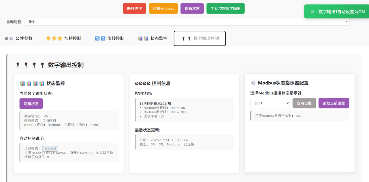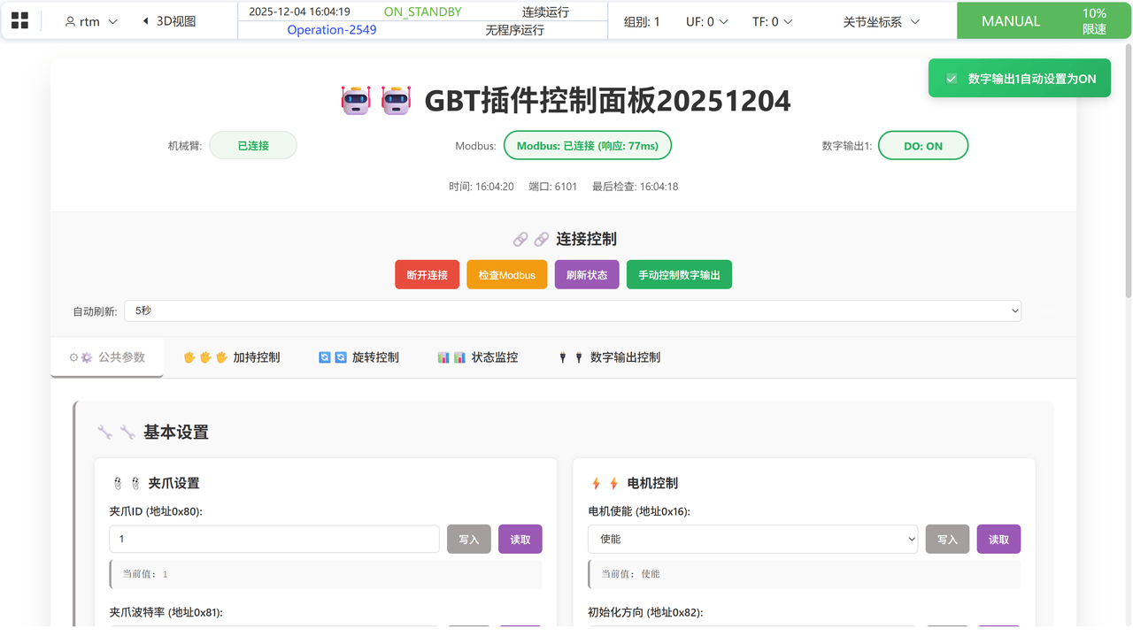 该状态通过读取从站寄存器信息检查 modbus 连接状态,并映射至数字输出状态,可供外部设备检查夹爪连接状态,连接正常为 1,失败为 0,配置信息可以在界面 “数字输出控制” 选择,默认地址数字输出 1