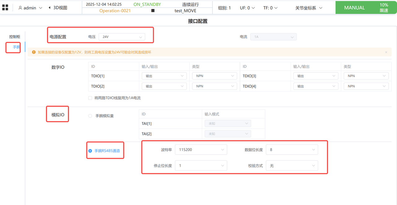 点击通讯 -- 接口配置 -- 手腕,配置相关通讯参数 (建议使用默认参数:115200,8,1,N)。
