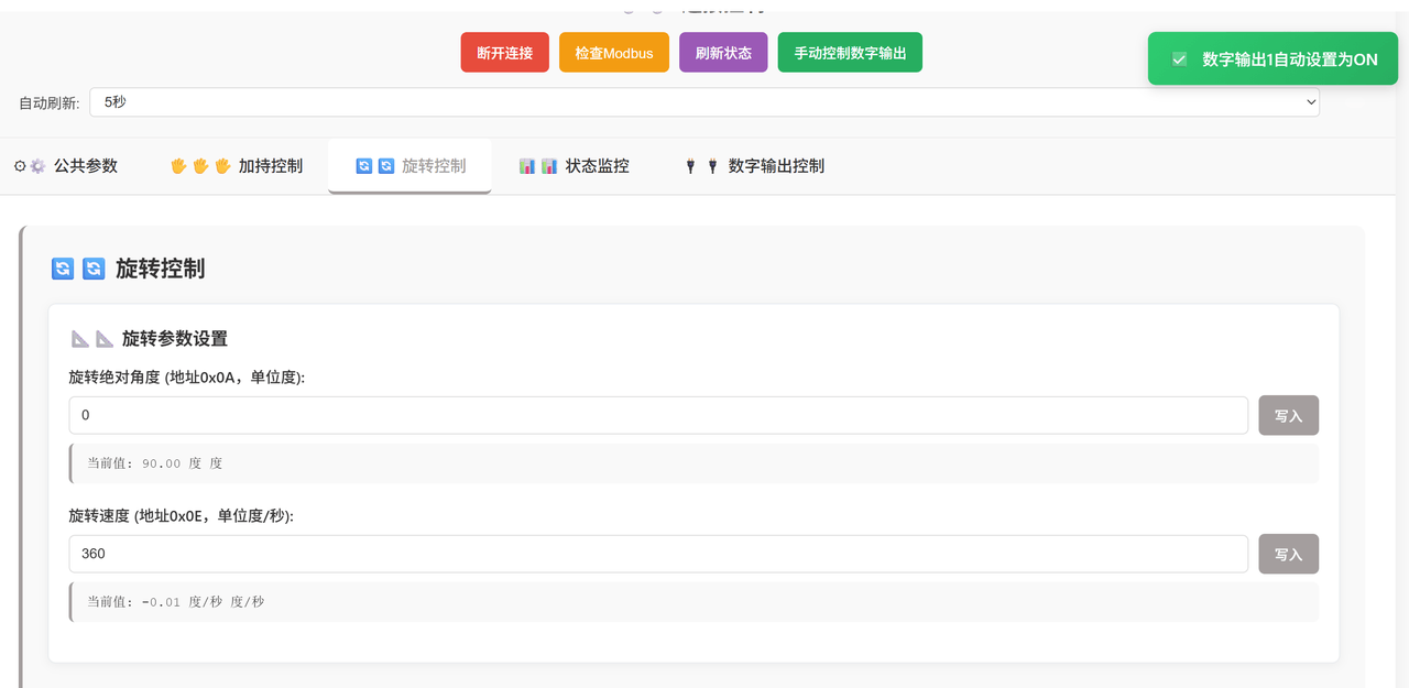 单位度 / 秒,范围 1-1080,点击写入修改速度,如果当前夹爪正在运动则写入速度不会立即生效