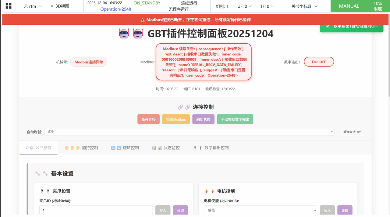 如果出现下图页面则表示插件未连接至夹爪,请检查接线和配置