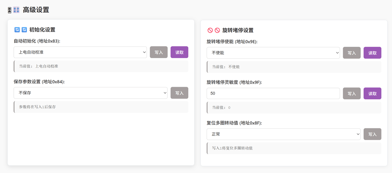 包含:ID, 波特率,初始化方向,自动初始化设置,旋转堵停使能,旋转堵停灵敏度