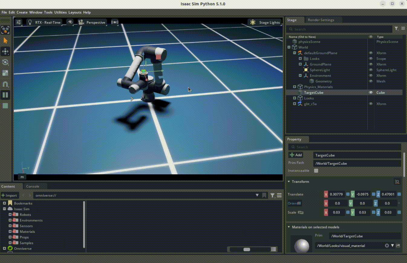 目标跟随演示展示了机器人如何使用 RMPflow 运动策略跟随移动的目标。该演示使用了 Isaac Sim 的运动生成框架。